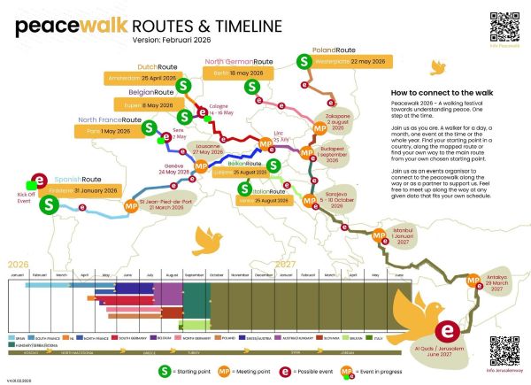 In questo percorso ci siamo anche noi. La Local March for Gaza ha deciso di contribuire dando forma al ramo italiano della Peacewalk: una direttrice che da Venezia — luogo simbolico di partenze, approdi e pellegrinaggi verso Gerusalemme, passando per Trieste, si collegherà al cammino principale in una città-simbolo delle guerre europee e delle atrocità: Sarajevo.